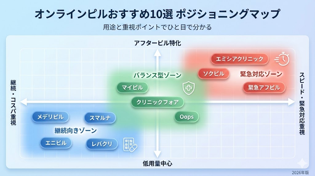 ここでは、料金・即日発送・24時間対応・取扱ピル種類を基準に、オンラインピルおすすめ10選を徹底比較します。